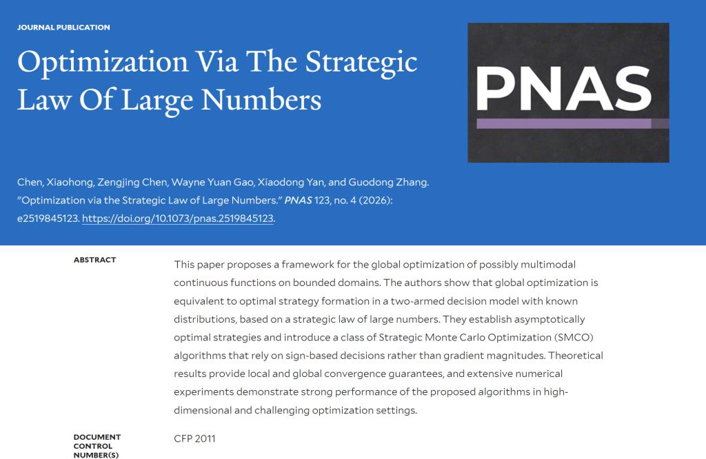 博彩平台网址大全 预聘制教授张国栋作为按姓氏排序、具有同等贡献的共同作者之一,与美国耶鲁大学Xiaohong Chen教授、山东大学陈增敬教授、美国宾夕法尼亚大学Wayne Yuan Gao教授、西安交通大学严晓东教授合作撰写的学术论文“Optimization via Strategic Law of Large Numbers”于2026年1月在国际顶级学术期刊《美国科博彩平台网址大全 院刊》(PNAS)正式发表。PNAS(Proceedings of the National Academy of Sciences)是与Nature、Science、Cell齐名的世界顶尖综合性学术期刊,在学术界具有广泛权威性,并在公众传播层面享有显著影响力。