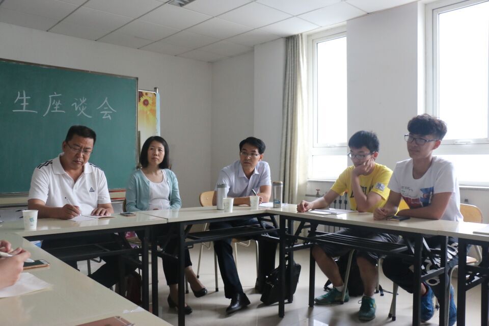在圣井校区召开师生座谈会,副院长刘贵基、教师代表郭洪峰、孟宪萌、副书记赵连幸、圣井校区各班学生代表参与了活动。