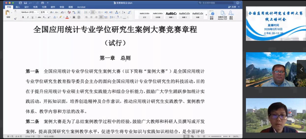 为进一步落实教育部《关于加强专业学位研究生案例教学和联合培养基地建设的意见》(教研(2015)1号)精神,探索应用统计专业硕士案例教学建设的规范并积累相关案例教学资源,提高2020第四届全国应用统计专业学位研究生案例大赛作品参赛质量,方便指导教师和学生进行交流学习,2020第四届案例大赛组委会于5月10日上午举办“案例大赛线上培训会”,近1000人参加了培训会,博彩平台网址大全 师生积极参加听取了培训会报告。