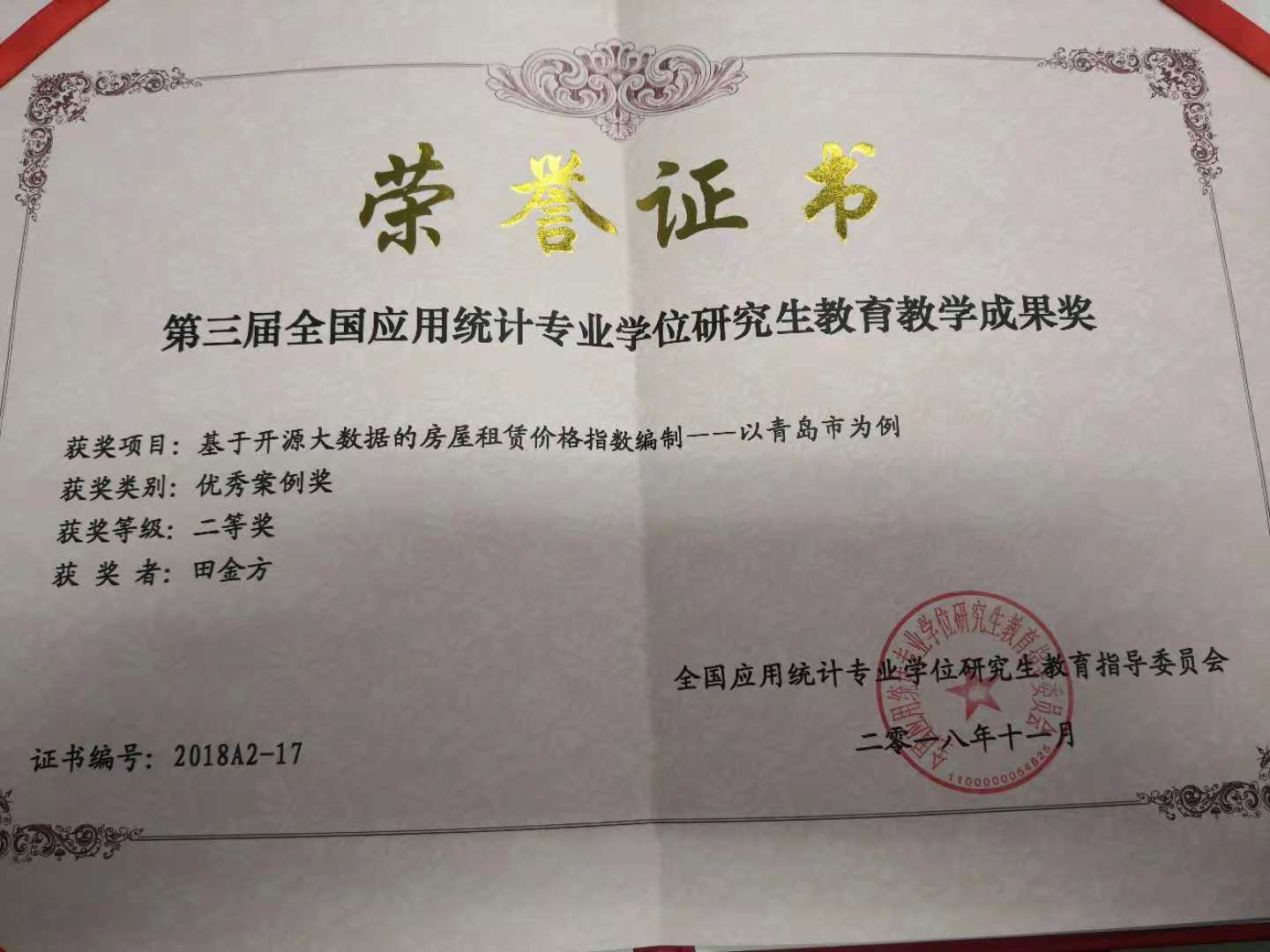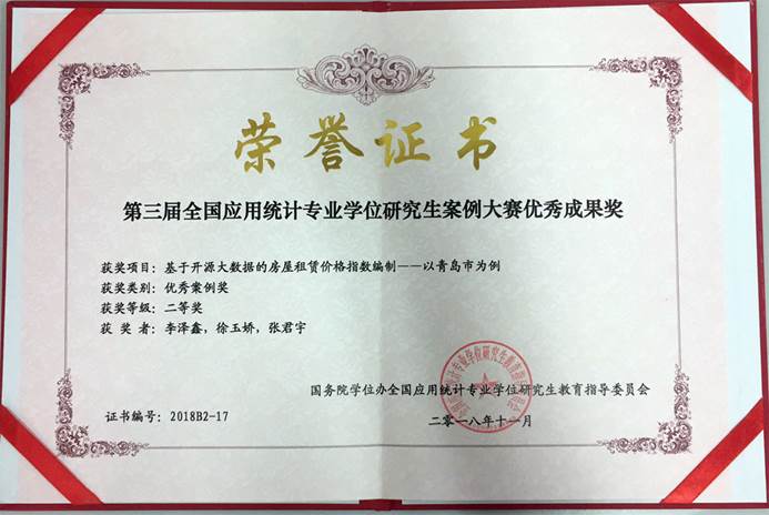 11月9日至11日,由国务院学位办全国应用统计专业学位研究生教育指导委员会(以下简称“教指委”)主办、中国统计教育学会高等教育分会主办,兰州财经大学统计博彩平台网址大全 承办的第三届全国应用统计专业学位研究生案例大赛颁奖典礼及学术交流会在兰州财经大学和平校区举行。2017级应用统计专业学位研究生李泽鑫、徐玉娇和张君宇合作完成的项目案例《基于开源大数据的房屋租赁价格指数编制——以青岛市为例》荣获大赛二等奖,同时作为应用统计专业学位研究生教学参考案例入选优秀案例库进行出版,指导教师田金方教授获得相应级别的研究生教育教学成果奖。