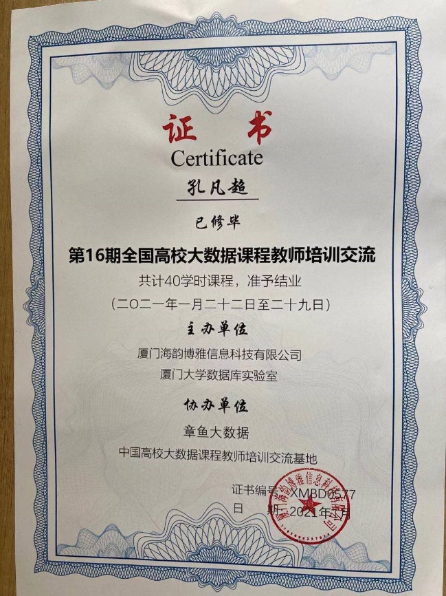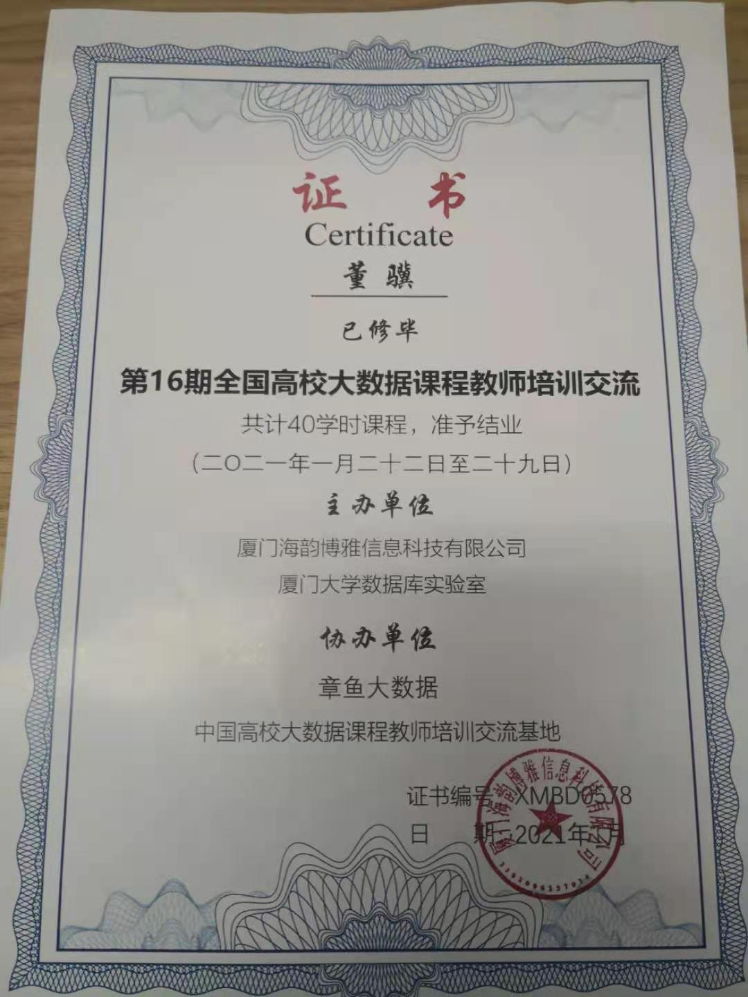 2021年1月22日至29日,由厦门海韵博雅信息科技有限公司联合章鱼大数据举办的“第16期全国高校大数据课程教师培训交流班(Hadoop+Spark综合班)”在厦门召开。本次培训交流班旨在为“加快中国高校大数据课程体系建设、促进中国高校大数据教学水平不断提升”做出积极贡献,邀请厦门大学云计算与大数据研究中心创始成员、高校大数据课程服务平台建设者、厦门大学计算机科学系副教授林子雨博士担任主讲教师。来自全国各大高等院校数据科学与大数据技术、计算机、软件工程等专业的科研、教学带头人,骨干教师参与了本次培训交流班。博彩平台网址大全 数据科学系青年教师孔凡超博士、董骥博士等参加了本次培训班。