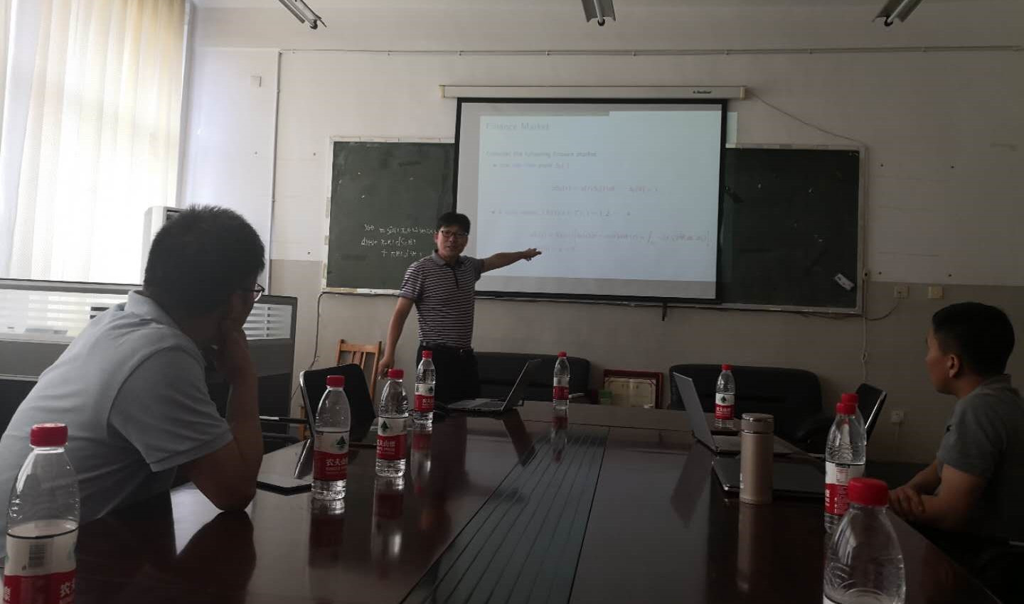 孟庆欣教授报告的题目是“Global adapted solution of backward stochastic Riccati equations with jump, with application to the mean–variance hedging”,研究了跳跃扩散控制系统的正则线性二次最优随机控制问题。利用相应的动态规划原理,得到了相应的倒向随机Riccati方程自适应解的存在唯一性,并研究了将其应用在一般随机市场环境下的均值方差套期保值问题。